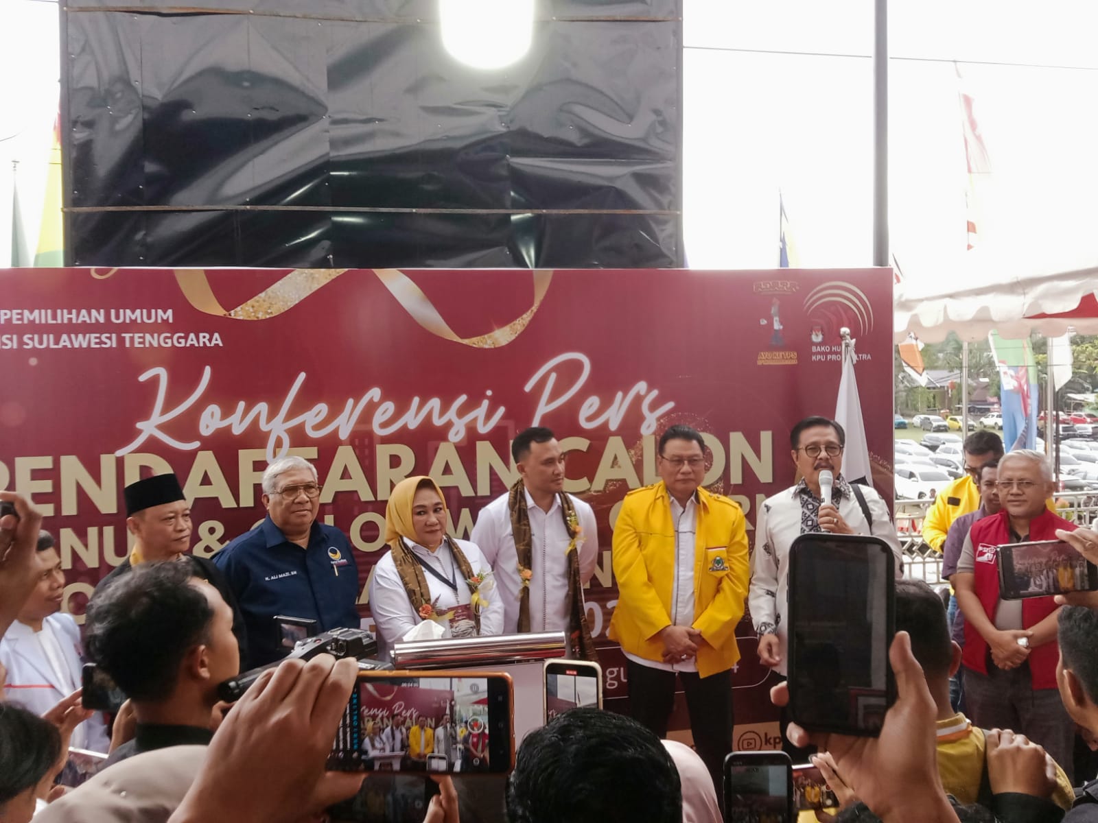 Tina-Ihsan didampingi Ketua dari partai pendukung Nasdem, Golkar, PSI, Ummat, dan PKS serta Ketua Tim Pemenangan, Nur Alam.